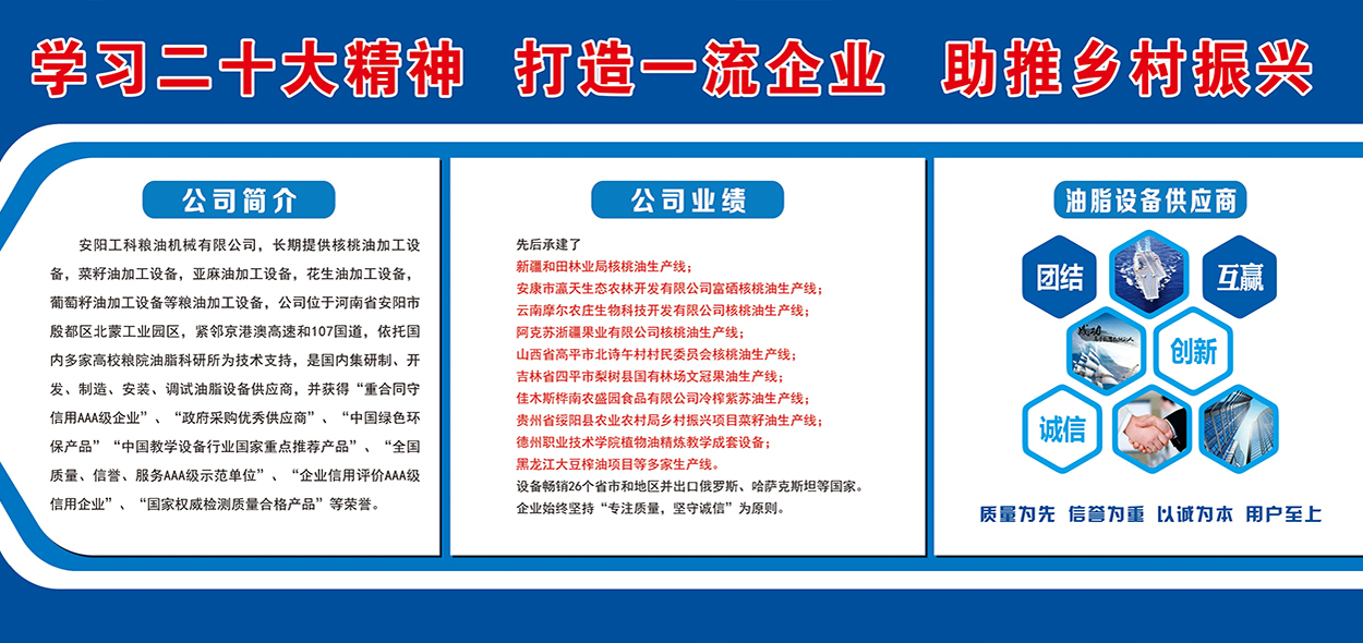 安陽工科糧油機(jī)械有限公司,長期提供核桃油加工設(shè)備,茶籽油加工設(shè)備,菜籽油加工設(shè)備,亞麻油加工設(shè)備,花生油加工設(shè)備,葡萄籽油加工設(shè)備等糧油加工設(shè)備,公司位于河南省安陽市殷都區(qū)北蒙工業(yè)園區(qū),緊鄰京港澳高速和107國道,依托國內(nèi)多家高校糧院油脂科研所為技術(shù)支持,是國內(nèi)集研制、開發(fā)、制造、安裝、調(diào)試油脂設(shè)備供應(yīng)商,并獲得“重合同守信用AAA級企業(yè)”、“政府采購優(yōu)秀供應(yīng)商”、“中國綠色環(huán)保產(chǎn)品”“中國教學(xué)設(shè)備行業(yè)國家重點推薦產(chǎn)品”、“全國質(zhì)量、信譽、服務(wù)AAA級示范單位”、“企業(yè)信用評價AAA級信用企業(yè)”、“國家權(quán)威檢測質(zhì)量合格產(chǎn)品”等榮譽。先后承建了新疆和田林業(yè)...